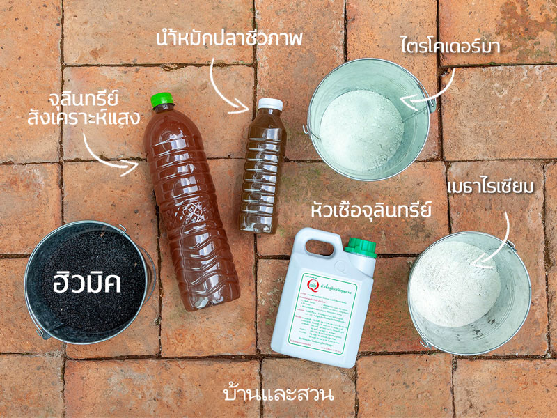 หัวเชื้อจุลินทรีย์ 1 ช้อนโต๊ะ , เชื้อราไตรโคเดอร์มา 2 ช้อนชา , เชื้อราเมธาไรเซียม 1 ช้อนโต๊ะ , ฮิวมิคแอซิด 1 ช้อนชา จุลินทรีย์สังเคราะห์แสง 250 มิลลิลิตร และน้ำหมักปลา หรือน้ำมูลไส้เดือน 250 มิลลิกรัม