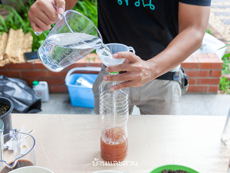 - ละลายหัวเชื้อจุลินทรีย์ , เชื้อราไตรโคเดอร์มา , ฮิวมิคแอซิด และเชื้อราเมธาไรเซียมเข้าด้วยกันกับน้ำปริมาณ 1 ลิตร คนให้ส่วนผสมทั้งหมดละลายดีแล้ว ตั้งทิ้งไว้ในร่มอย่างน้อย 30 นาที ให้จุลินทรีย์เริ่มทำงาน