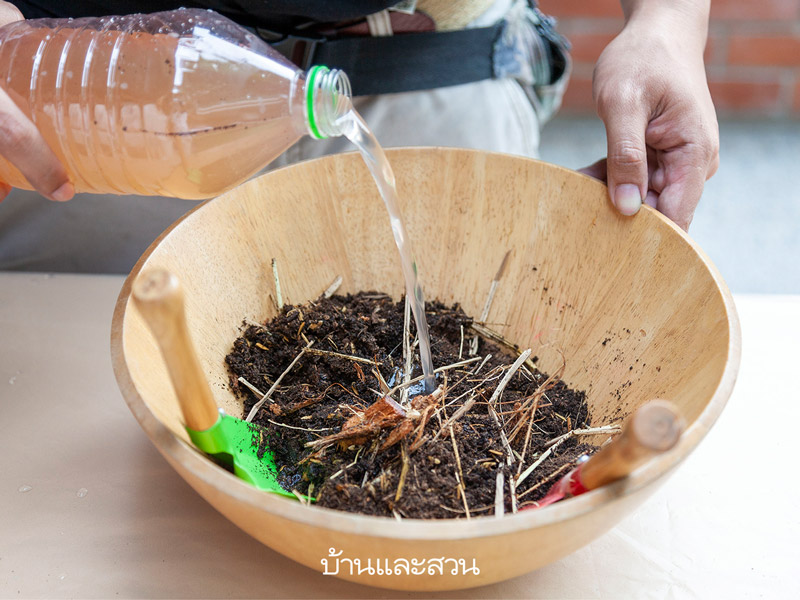 - จากนั้นนำมารดลงบนส่วนผสมดินที่ได้คลุกเคล้าเตรียมไว้ก่อนหน้านี้จนชุ่ม จากนั้นคลุกเคล้าให้เข้ากัน รอให้ดินดูดซึมสารละลายชีวภัณฑ์ให้พอหมาด ๆ เมื่อใช้มือกำดินขึ้นมาแล้วสามารถจับตัวเป็นก้อน ไม่แตก เท่านี้ก็พร้อมสำหรับการลงปลูกแล้วค่ะ