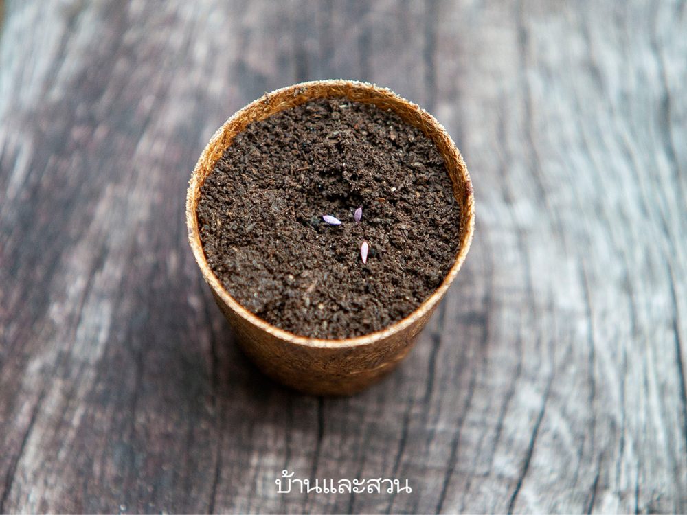 - ใส่พีทมอสลงในถาดเพาะ โดยให้มีให้ต่ำกว่าขอบถาดเพาะประมาณ 1 เซนติเมตร ใช้นิ้วมือกดพีทมอสให้เป็นหลุม ลึกกว่าขนาดของเมล็ดพันธุ์ประมาณ 1 – 2 เท่า จากนั้นใช้ที่คีมปลายแหลม หยอดเมล็ดลงหลุม แล้วกลบทับอีกครั้งด้วยพีทมอสแบบบาง ๆ สเปรย์น้ำให้ชุ่ม