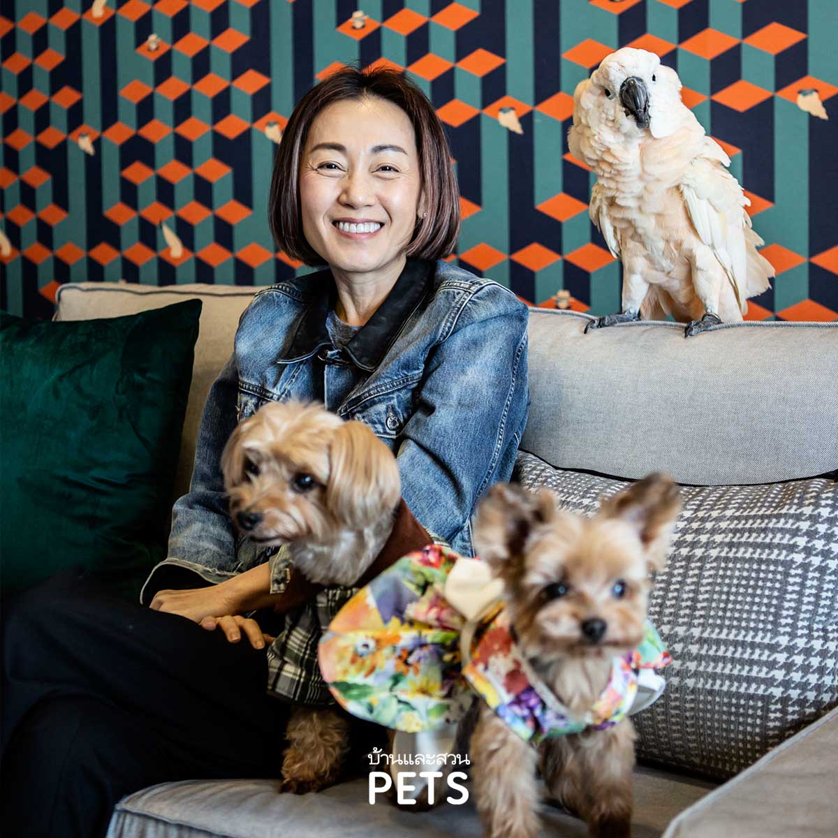 ภาพของคุณเพชรลดากับสุนัขพันธุ์ยอร์กเชียร์ เทอร์เรียร์ 2 ตัว มันนี่ กับ ปีใหม่ สองพี่น้องวัย 16 ขวบ อาจจะเป็นภาพคุ้นตาตามสื่อต่างๆ แต่ความพิเศษของการพูดคุยครั้งนี้คือ แฮปปี้ นกกระตั้วสีขาวนวลวัย 11 เดือนที่มานั่งร่วมวงในการสนทนากับเราด้วย ท่ามกลางบรรยากาศตกแต่งห้องในคอนเซ็ปต์ Mid-Century Modern โดยมีฉากหลังเป็นลายวอลล์เปเปอร์สุดสร้างสรรค์ที่สื่อถึงไลฟ์สไตล์ของคนยุคใหม่ออกแบบโดยคุณจิรายุ คูอมรพัฒนะ หรือ JIRAYU KOO ศิลปิน Illustrator ที่มีลายเส้นโดดเด่นเป็นเอกลักษณ์ ณ โครงการ เมทริส พัฒนาการ-เอกมัย คอนโดเลี้ยงสัตว์ได้