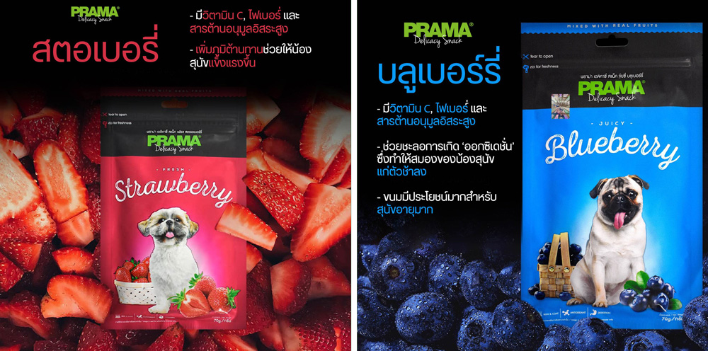 PRAMA™ Delicacy Snack ต้องการทำสิ่งที่แตกต่าง จึงได้คิดค้นและผลิตขนมที่ตอบโจทย์สำหรับคนรักสุนัขและใส่ใจเรื่องสุขภาพเป็นสำคัญ โดยการเลือกจับคู่วัตถุดิบระหว่างเนื้อไก่แท้เต็มชิ้น (Human Grade) ที่มีโปรตีนสูง ไขมันต่ำ ไม่ต้องกลัวอ้วน กับเนื้อผลไม้แท้ 100% อย่าง บลูเบอร์รี่ สตรอเบอร์รี่ กล้วย เมลอน ฟักทอง และมะม่วง โดยปราศจากสารปรุงแต่ง มาช่วยเสริมทัพคุณค่าทางอาหารจากวิตามินและแร่ธาตุที่สำคัญต่อร่างกาย อีกทั้งยังทำให้มีกลิ่นหอมเย้ายวนใจ และได้รสชาติที่มีความเป็นธรรมชาติมากที่สุด ให้กับ PRAMA Delicacy Fruity