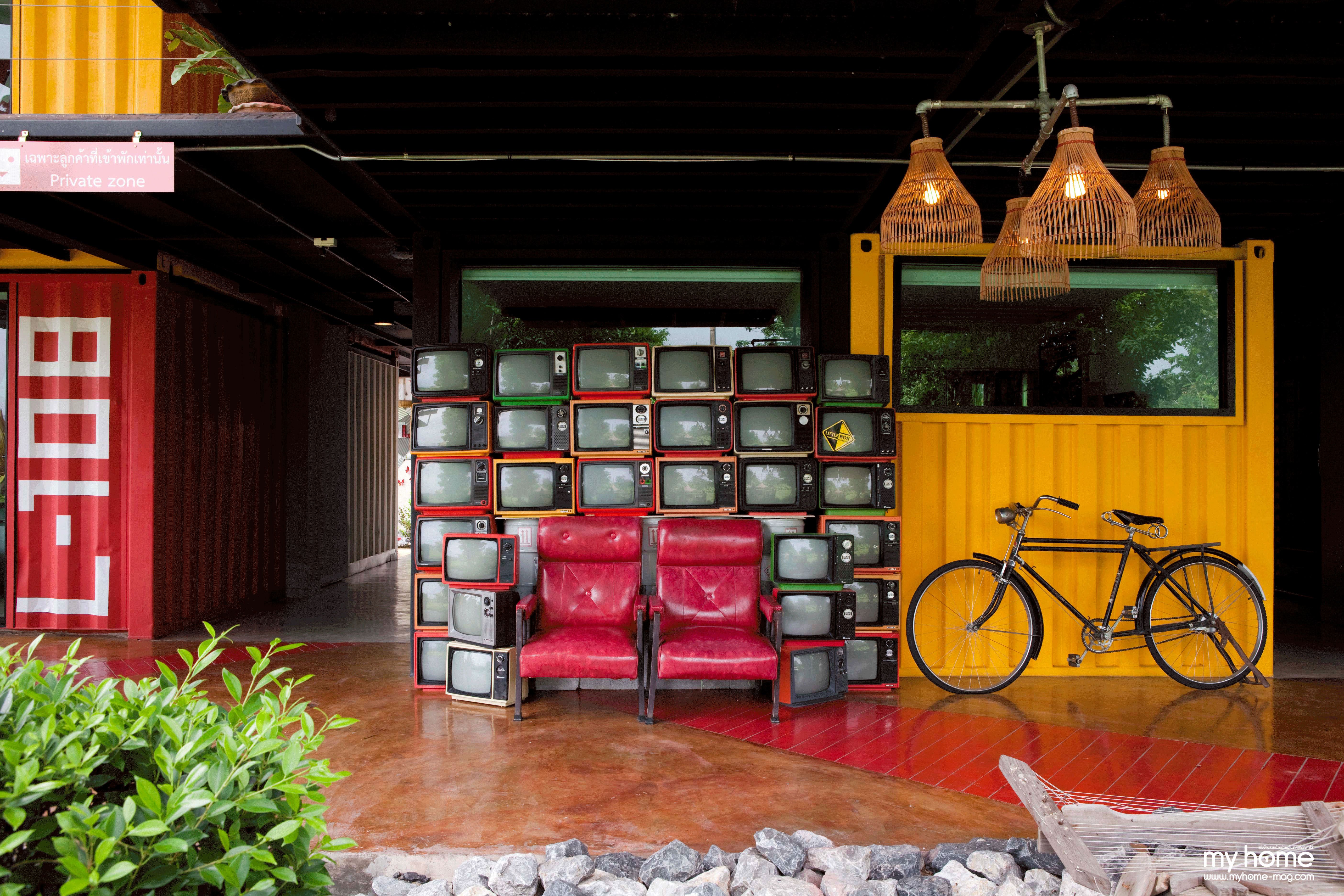 โครงสร้างของอาคารส่วนใหญ่เป็นเหล็กและตู้คอนเทนเนอร์สีเหลืองแดงตัดกันดูสนุกๆ ผสานกันอย่างลงตัวกับเฟอร์นิเจอร์ไม้ของเก่าบรรยากาศโดยรอบตกแต่งด้วยชิ้นงาน DIY เก๋ๆ และแสงไฟยามค่ำที่จัดวางไว้อย่างลงตัว ทำให้ภายในโรงแรมดูสวยและมีสไตล์