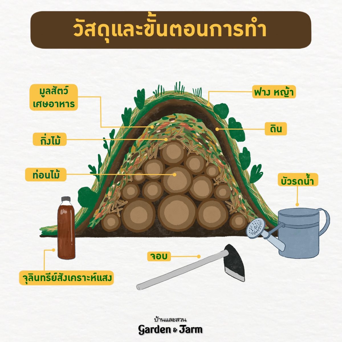 - หลังจากนั้นให้นำใบไม้ เศษอาหาร และมูลสัตว์ มาใส่ลงในช่องว่างของกิ่งไม้ให้เต็มเป็นการเพิ่มธาตุ ภายในกองจะเรียงวัสดุขนาดใหญ่ที่ย่อยสลายช้าไว้ด้านล่าง และค่อยๆไล่ลำดับเป็นวัสดุที่เล็กลงซึ่งย่อยสลายเร็วกว่า เพื่อให้เกิดกระบวนการย่อยสลายอยู่ตลอด ทำให้ต้นพืชได้รับสารอาหารอย่างต่อเนื่อง