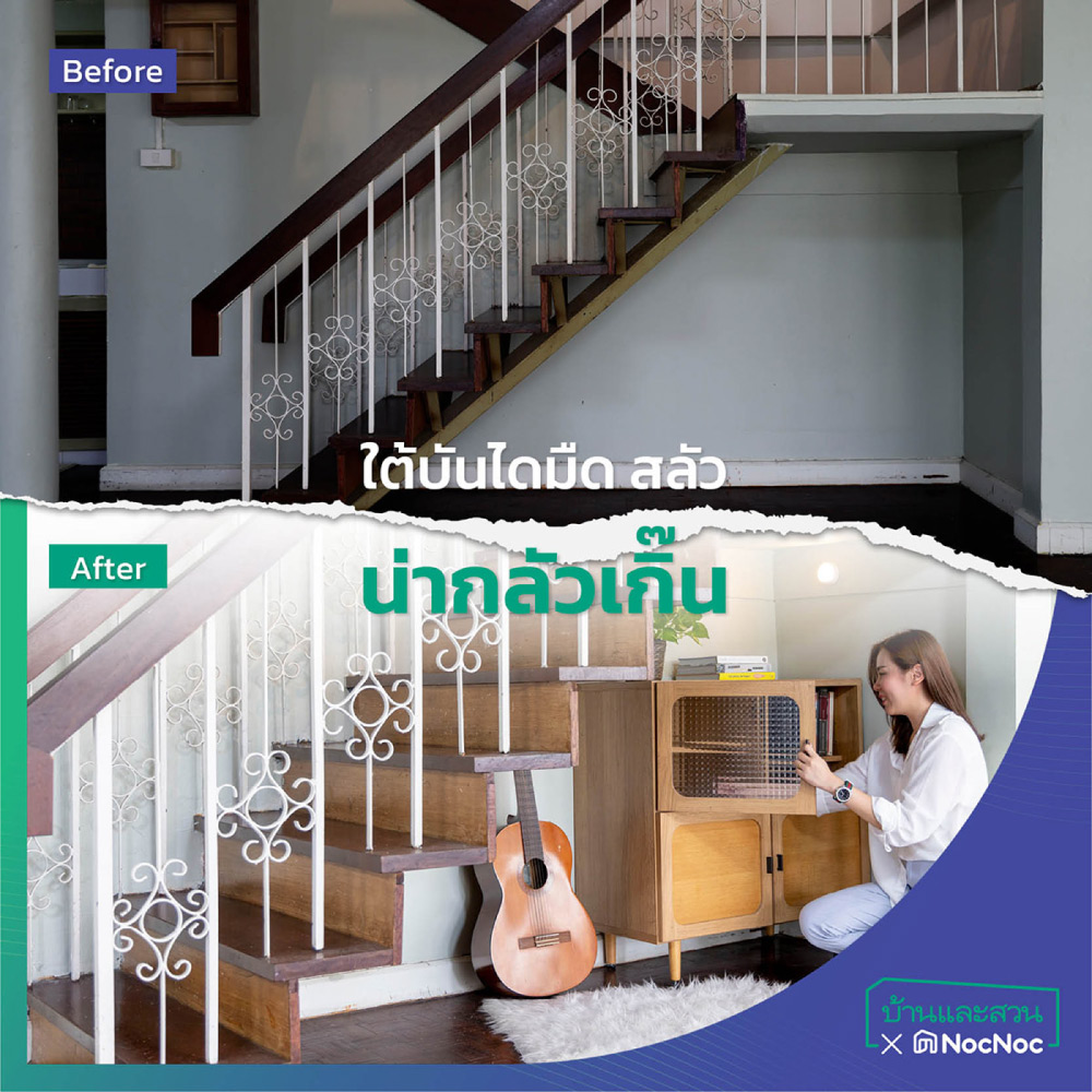 คราวนี้เดินผ่านใต้บันไดก็ไม่ต้องจินตนาการเรื่องหลอนกันแล้ว แถมยังเปลี่ยนพื้นที่ที่น่ากลัวจนไม่ค่อยได้ใช้ ให้เกิดประโยชน์ได้มากขึ้น อาจจะทำเป็นที่เก็บรองเท้า ติดชั้นวางหนังสือทำเป็นมุมสงบส่วนตัว ก็จะได้ทั้งพื้นที่ใช้สอยเพิ่ม และกำจัดมุมหลอนในบ้านไปอีกหนึ่ง
