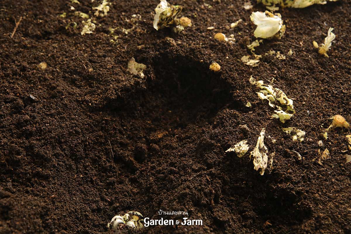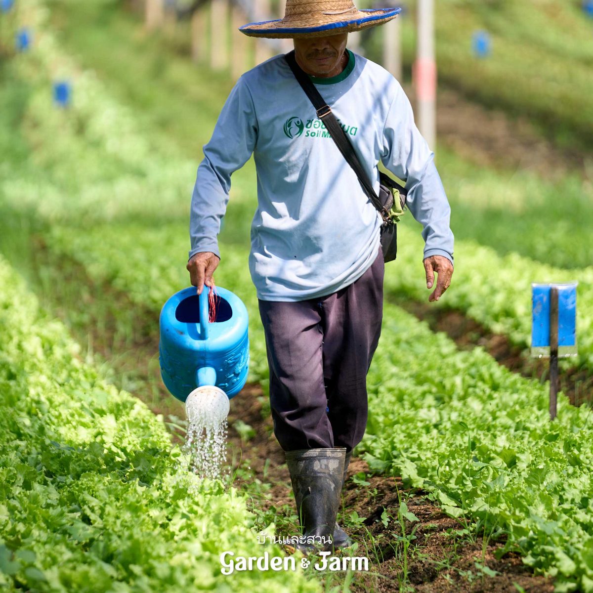 เมื่อถึงเวลาที่ดินในแปลงนั้นพร้อมใช้งานก็ให้ปุ๋ยอินทรีย์บำรุงดินเพิ่มเติม เพราะดินแต่ละพื้นที่มีปริมาณธาตุอาหารไม่เท่ากัน ในช่วงเตรียมดินก่อนปลูกผักแต่ละครอป ไม่ว่าจะเป็นแปลงปลูกผักสลัดกว่า 30 ชนิด หรือผักกินผล เช่น มะเขือเทศ พริกหวาน แตงกวาญี่ปุ่น และเมลอน เราใส่ปุ๋ยหมักและปุ๋ยคอกเพื่อเพิ่มธาตุอาหารให้แก่พืช ทั้งยังช่วยให้ดินโปร่ง ร่วนซุย และดูดซับน้ำได้ดี ทำให้ผักเจริญเติบโตให้ผลผลิตและรสชาติดีด้วย หลังจากเก็บเกี่ยวผักในแต่ละรุ่นแล้ว เราจะพักดินประมาณ 2 สัปดาห์ ถึง 1 เดือน จึงค่อยลงปลูกในครอปต่อไป